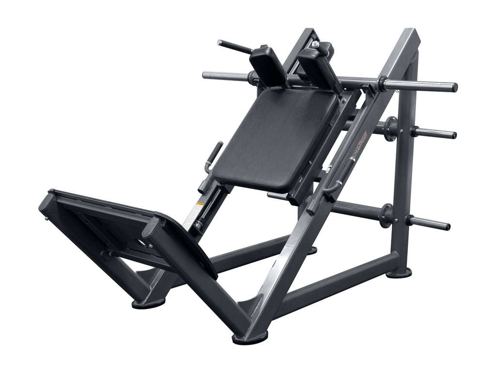 The Elite Series Hack Squat combines elegant aesthetics with a robust, heavy-duty frame. The 45-degree angle allows users to add a massive load to the weight load, while the dual safety spotting points give the machine extra safety. The carriage sits on a 50m guide rods with a full line of linear bearings for maximum smoothness and comfort. This machine is commercial grade and rated to hold over 1000lbs.