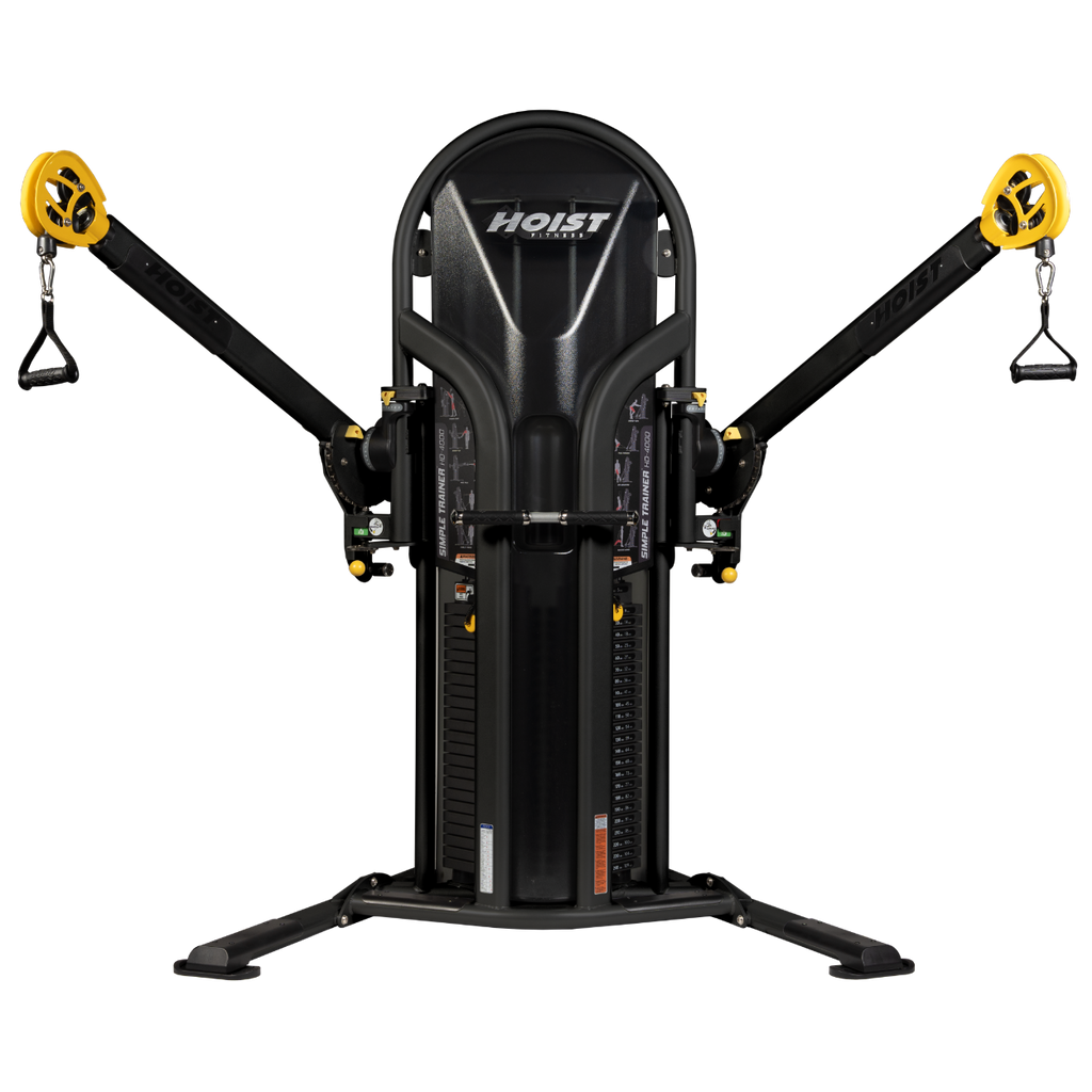 The HOIST® Simple Trainer takes functional training to the next level with HOIST’s® patent-pending, dual-axis adjustment system that controls both vertical and horizontal adjustment of the arms – at the same time! – with a single easy-to-adjust lever per side. With 12 height positions and 9 width positions for each arm, this easy-to-use, quick-set functional trainer will get your clients lifting faster – and having more fun – in your commercial or light commercial fitness space. Our Simple Trainer’s cables remain centered with the axis of arms’ rotation, preventing slack as adjustments are made, while providing a smooth, consistent feel for users. Accessories include stabilizing handles and water bottle/phone holder.